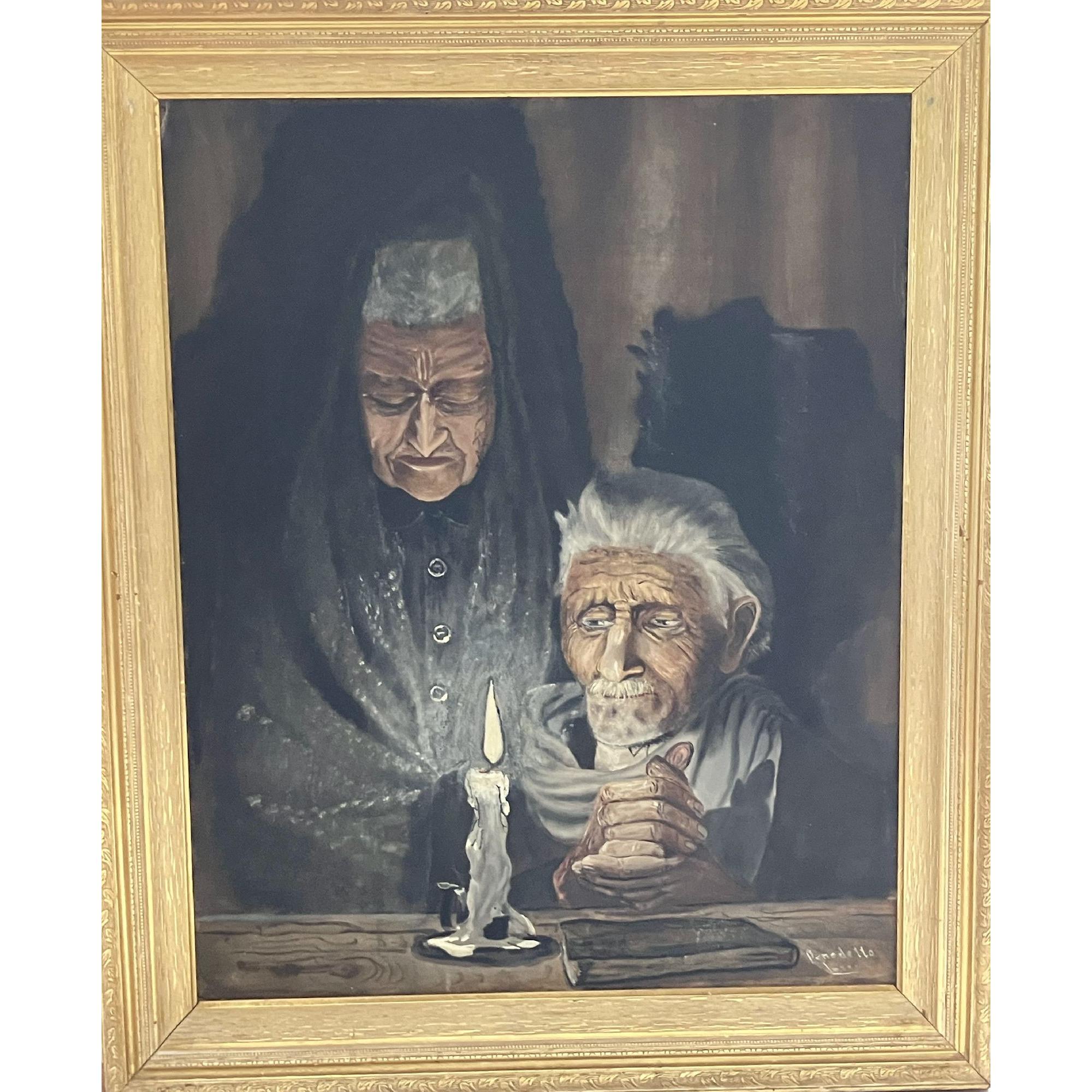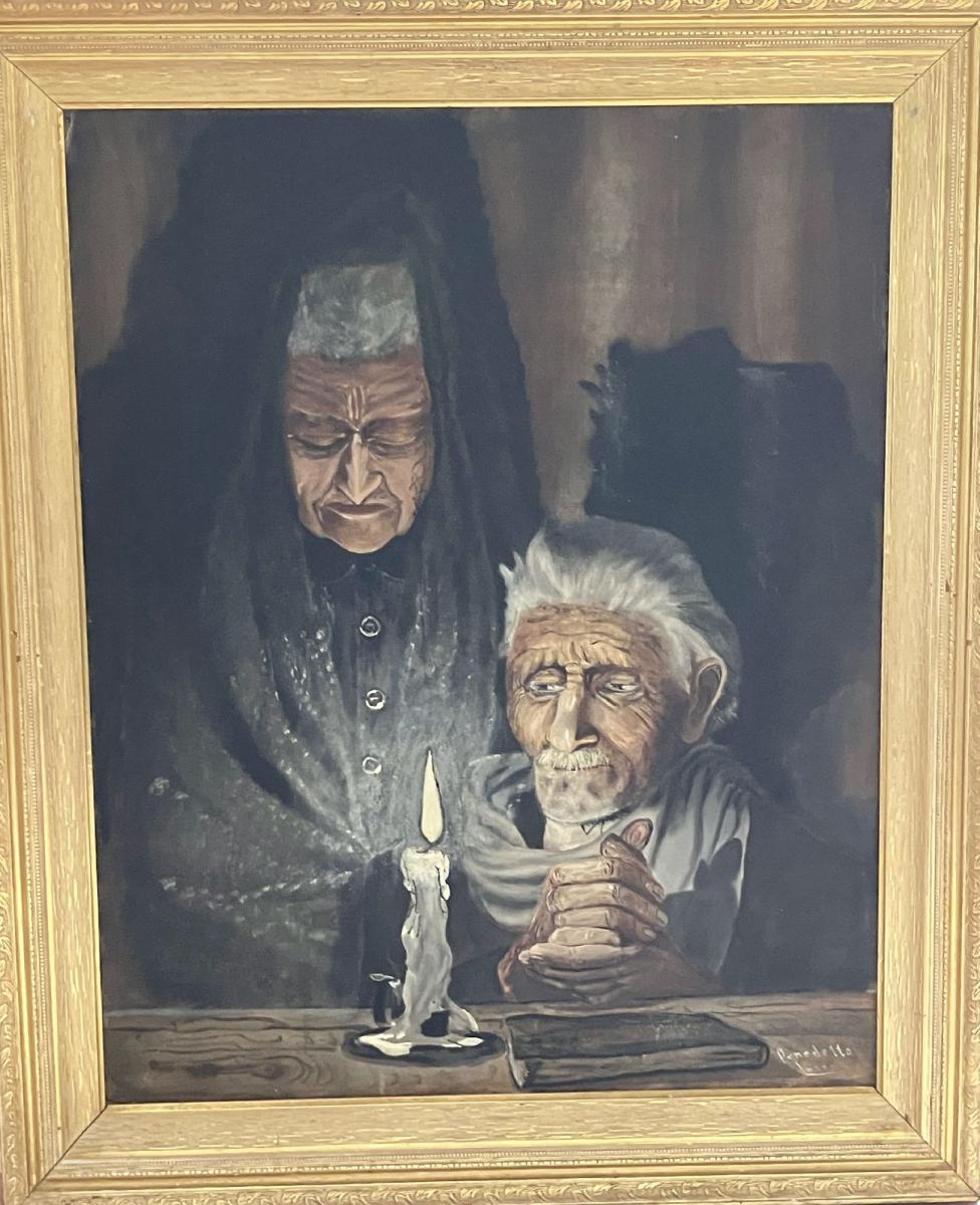 C’è qualcosa di inquietante ed al tempo stesso tenero in questo quadro. Il mondo in cui la luce della candela scolpisce i contorni dei due volti é stato un effetto cercato a lungo dall’artista che in quel periodo si dedicò molto allo studio della luce. La figura in piedi, avvolta nell’ombra, é il tempo che veglia sull’anziano seduto il quale sembra aggrapparsi a qualcosa, forse la vita.
